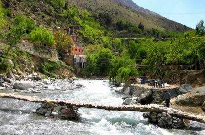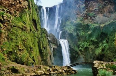 Ouzoud Waterfalls Day-Trip Starting from Marrakesh, a day’s visit to the famous Ouzoud waterfalls of about 100 metres in height and which constitute one of the most spectacular natural beauty spots in Morocco. It is about a three hour drive to get there. The surrounding countryside offers red cliffs, oleander and doves and, if you are lucky, you will catch a glimpse of some Barbary apes. Bird-watchers will enjoy a trip to the waterfalls too, as will walkers who can enjoy the area at any time of year, except perhaps the hottest summer months of July and August. There are plenty of places to have lunch with a view over the waterfalls from their terraces. And a short walk will bring you to the top of the falls from where you can look down at their full magnificence and at the river. The best view of the falls is from the bottom – good exercise as well as there are some 1000 steps! On the road back to Marrakesh at Demnate, we drive the six kilometres to Imi-n-Ifri, which in the local dialect means “door to the cave”. It is a natural rock bridge formed by the an underground cave system collapsing. The views from here are spectacular as the Méhasseur River flows between the sheer, vertical rock walls. Gallery